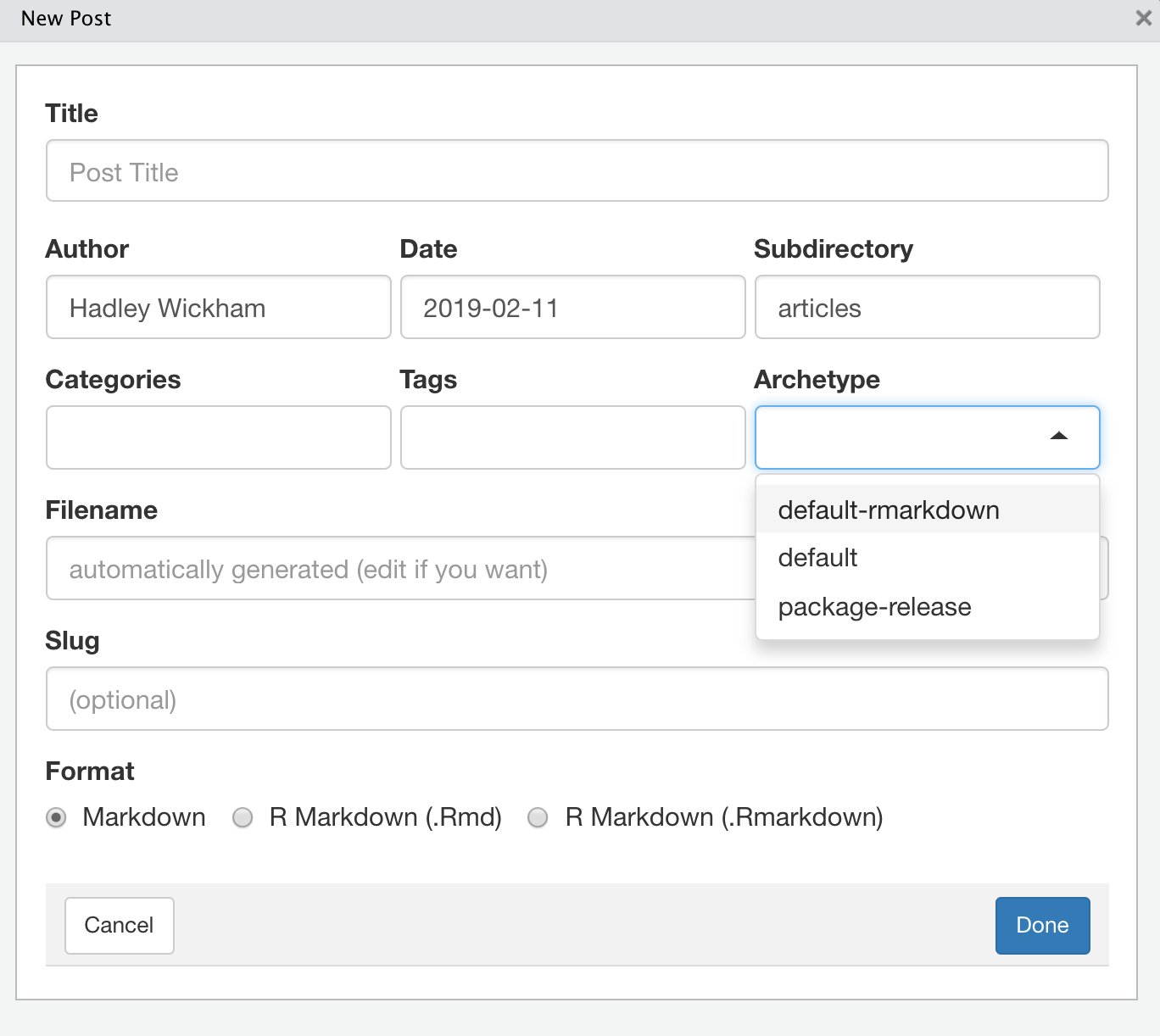 Use the “New Post” Addin in RStudio to create any and all new content for your site (not just posts!). Be sure to use the handy dropdown menu to select from all the possible archetypes. Also, careful about the subdirectory here- some themes use blog, others use news, articles, or posts.