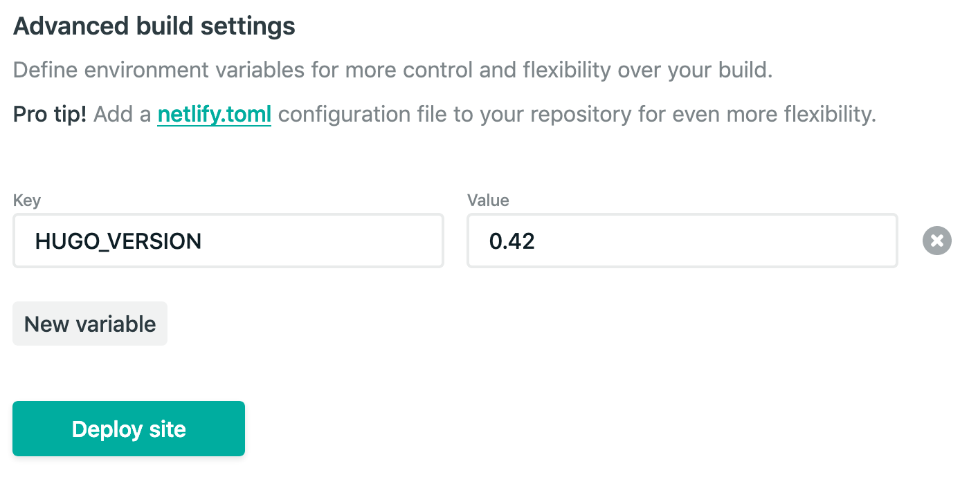 Now, we want Netlify to use this same version of Hugo when it builds your site. You can do this two ways: