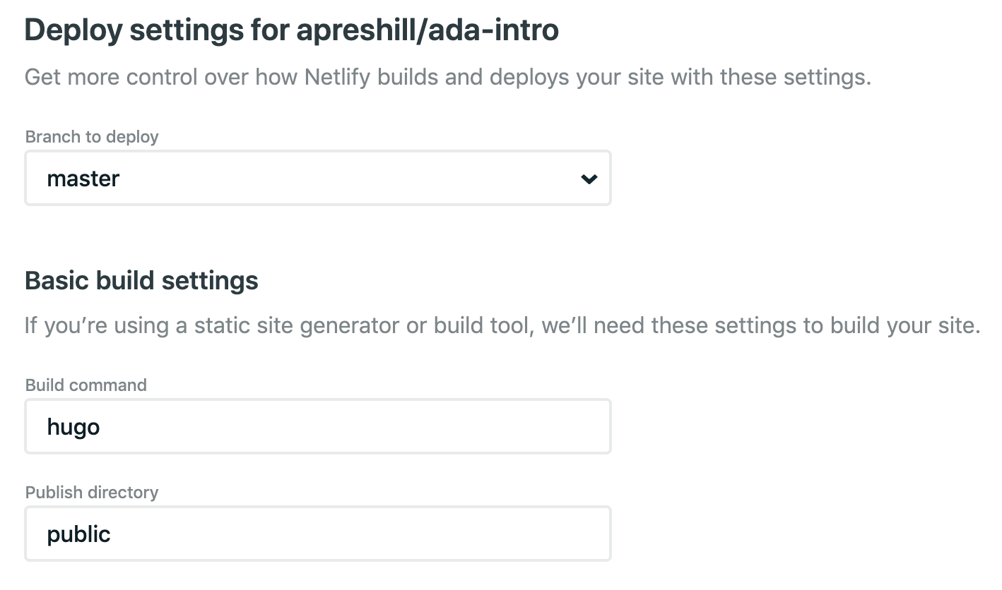 The last step is to use the Netlify UI in browser do New Site from Git > pick your repo. You’ll be prompted to fill in these fields, they are probably already filled in correctly for you: