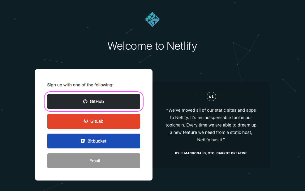 Sign up with GitHub to connect your GitHub and Netlify accounts (as shown below).