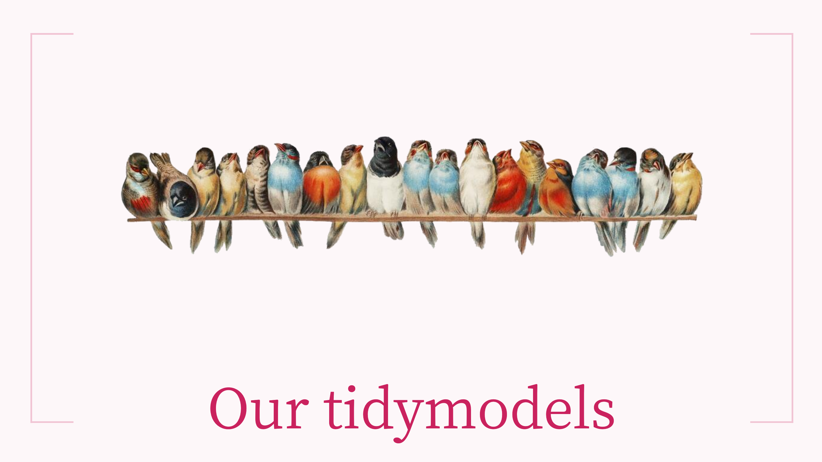 Thanks also to Greg Wilson for his support, and Stephan Kadauke for being an awesome co-pilot. Extra special thanks to Desirée De Leon, who has the biggest heart of all. Knowing that I didn’t have time for creativity with my slides, she surprised me with the most beautiful xaringan slide deck theme based on tidymodels.org. I merged in her PR with glee and delight, I know the participants felt those same emotions too (while learning about machine learning, no less!) 🌼